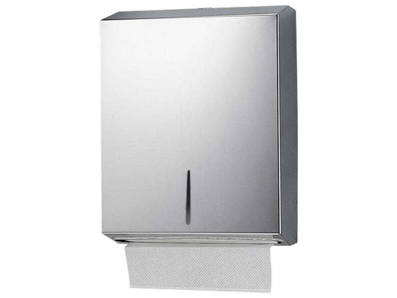 Hand towel dispenser, brushed stainless steel.