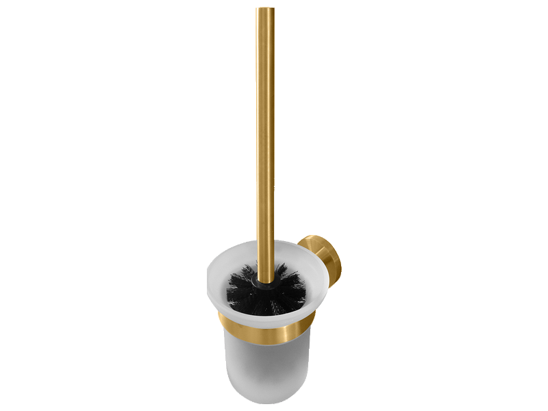 Wall toilet brush holder, brass, treatment PVD « brushed brass ». Safety frosted glass dish.