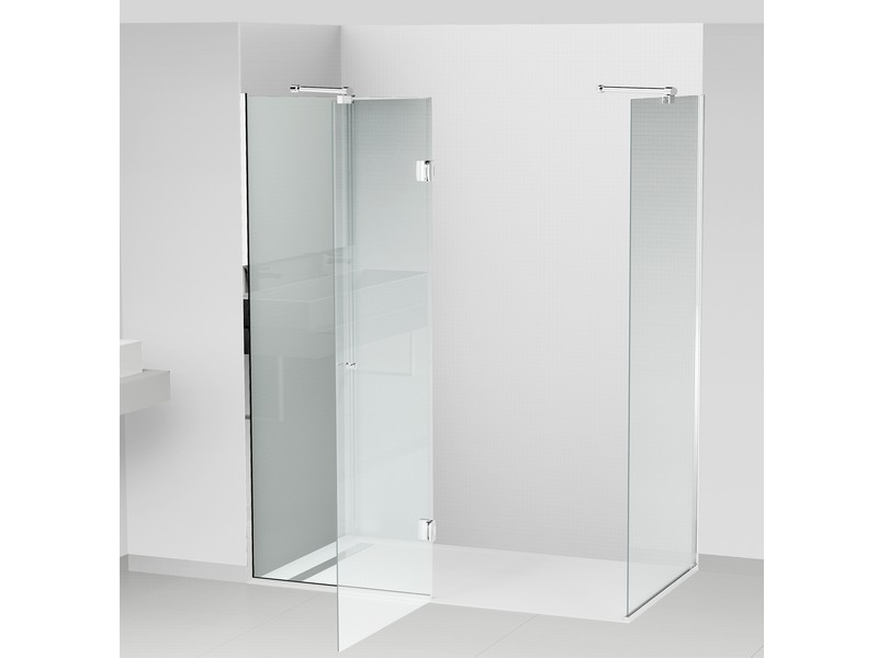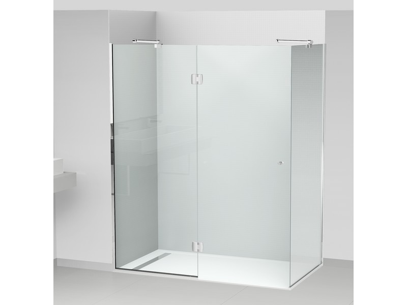 – 1 porte pivotante montée sur 2 charnières Vitro verre / verre, laiton massif chromé brillant.