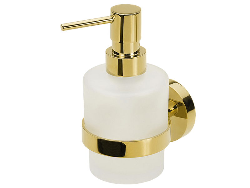 Distributeur de savon liquide. Support mural en laiton, traitement PVD « doré brillant ».