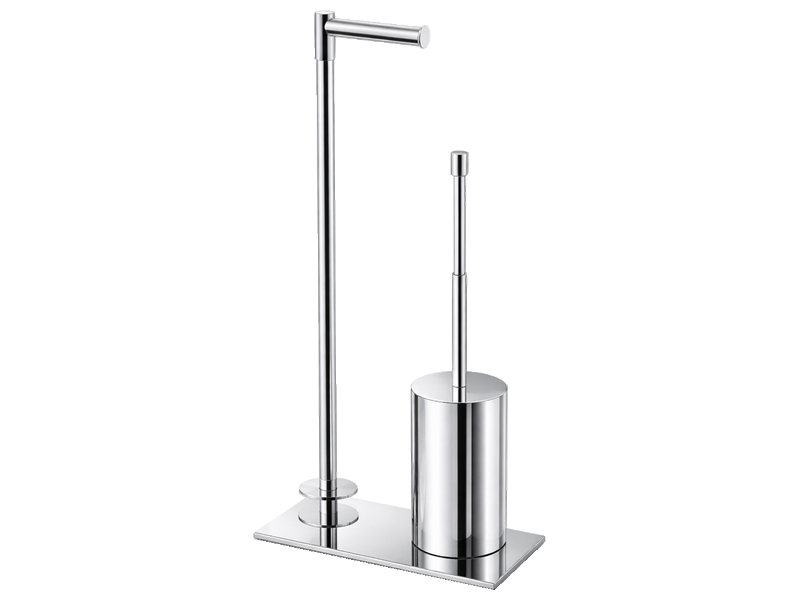 Distributeur papier rouleau simple + pot balai mobile en laiton chromé brillant.