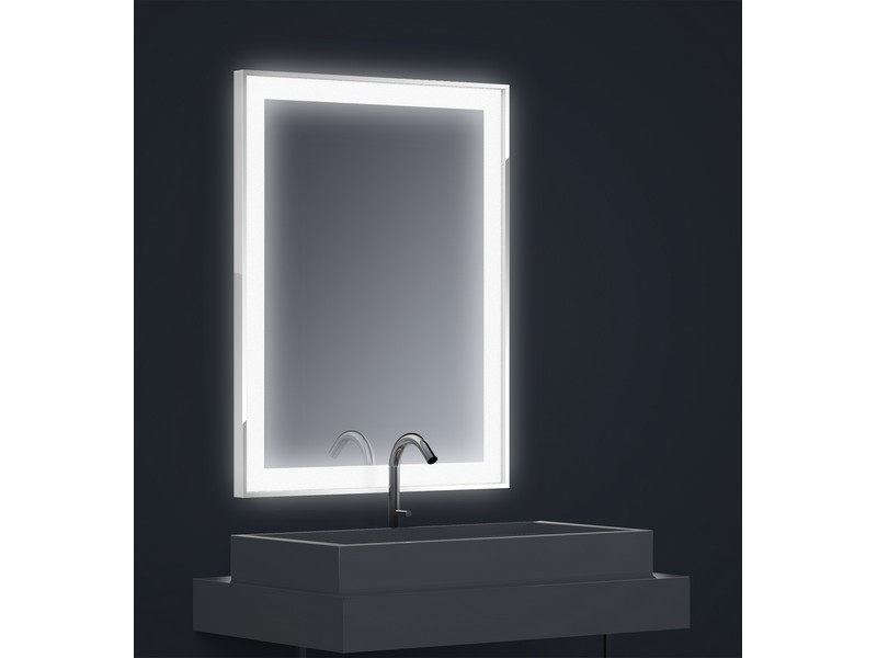 Miroir rétro-éclairé LED L700 x H900 x P25 mm, bande dépolie rectangle en bordure, chant encadré inox.