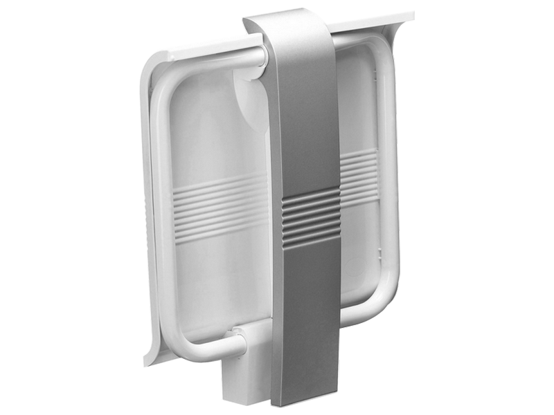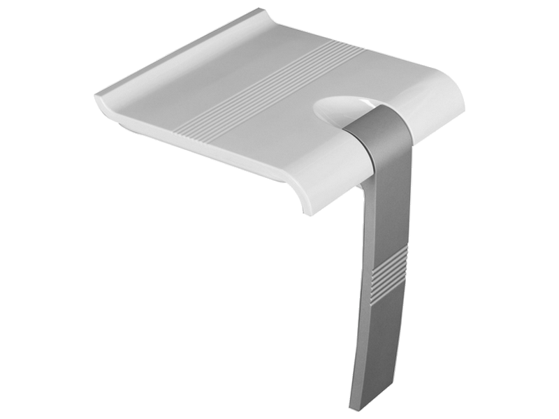 Siège PMR escamotable S-Line, assise blanche + pied d’appui gris mat.